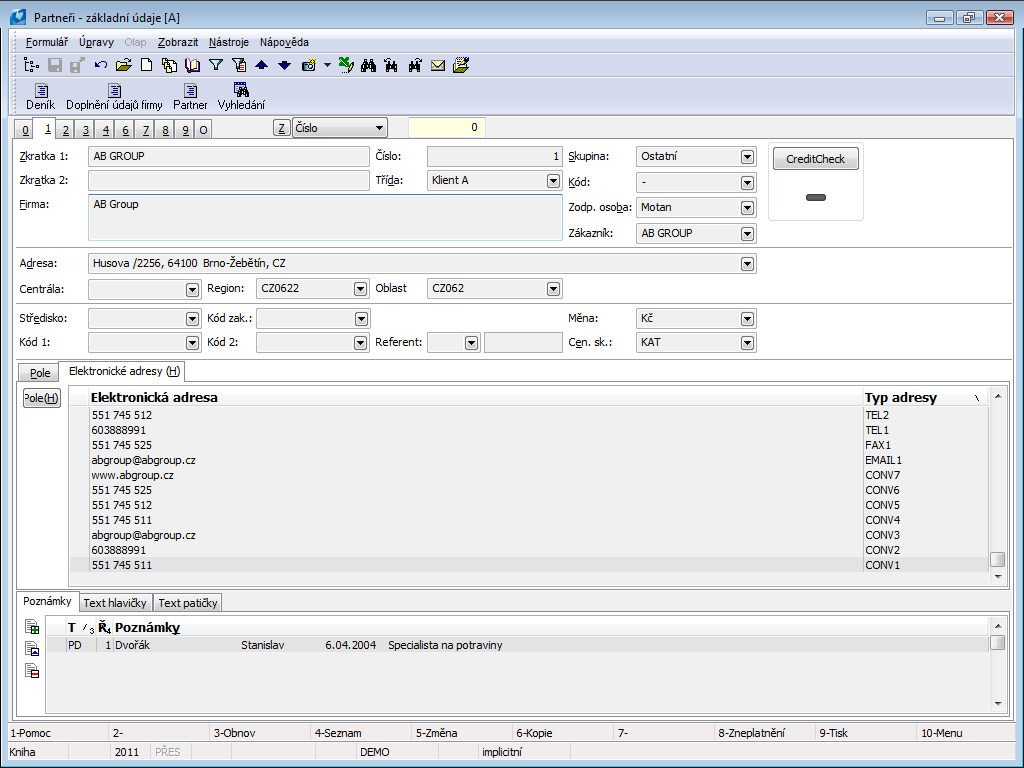 The items on the 1st page are used for the user quick orientation about the basic information of the selected partner. A new partner card can be standardly inserted by Ins key. It is not possible to delete a partner card from the database. We can only change the customer data on the partner card if there is no link to the customer. If the partner has a relation to the customer and the commercial documents has not been issued on this customer, you can change his/her data, but on the Customer/Supplier card.