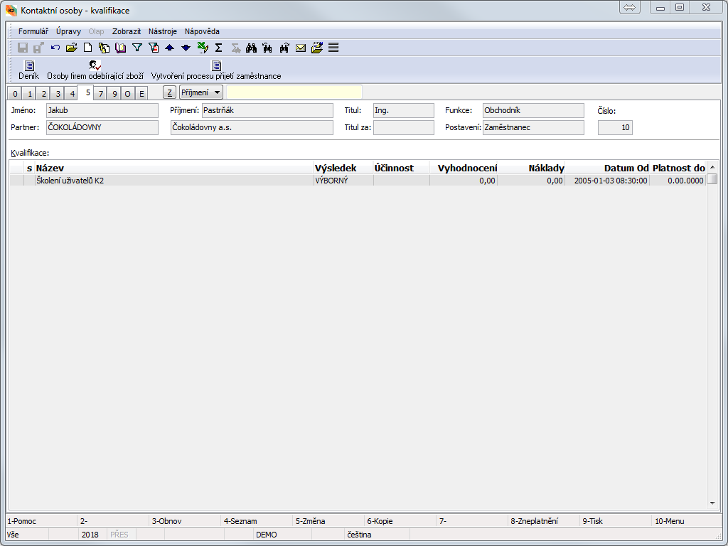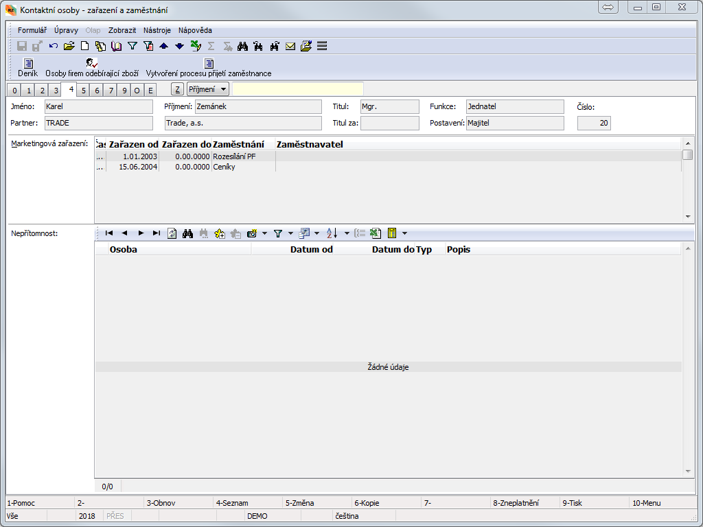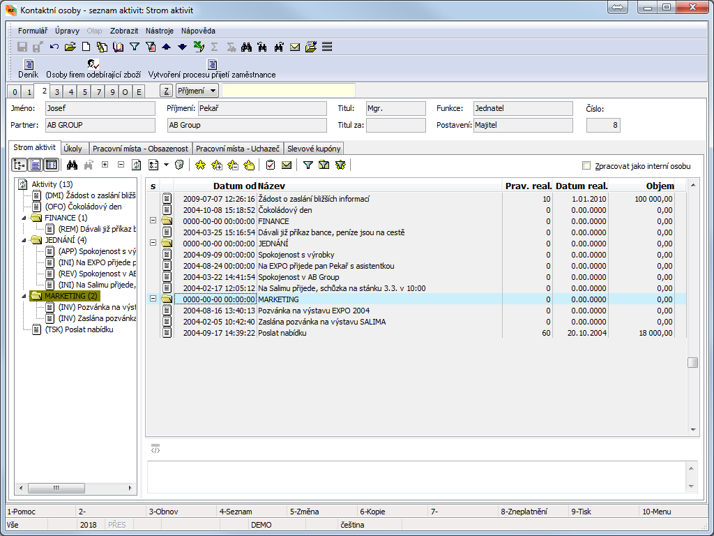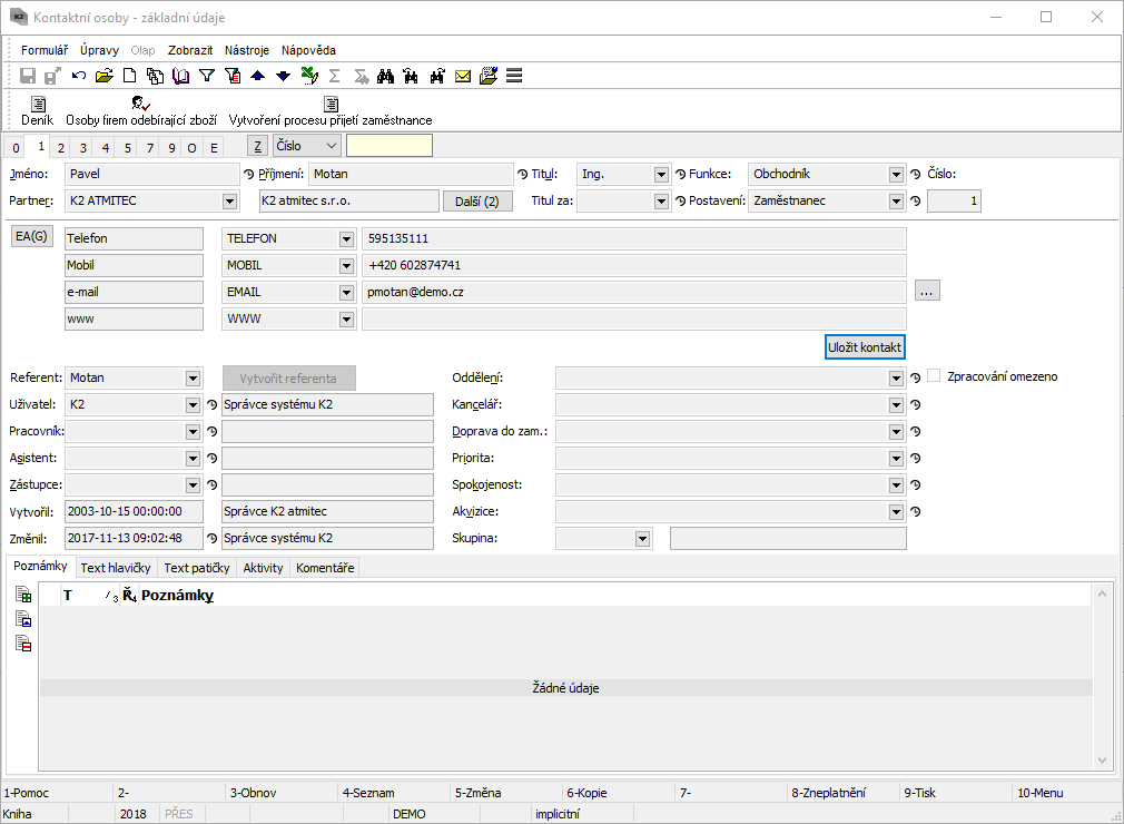 The contact person's card is linked to data from  the Partner's card (eg activity diary), but also  other fields important for  the inclusion of a specific person. If we want to register only the contact person and activities  related to it, we must create a fictitious partner with the abbreviation equal to Surname. You paste the surname, name and title of this person to the partner name. On the contrary, if you contacted the partner at whom you do not know the exact initials of the contact person, you create a new card of the contact person (for the registration of activity) but to the Surname field you paste the information that you know or expect (e.g. secretary, economist, accountant etc.). If one contact person comes up for more partners, it has to be submitted for each partner separately (by the individual card).