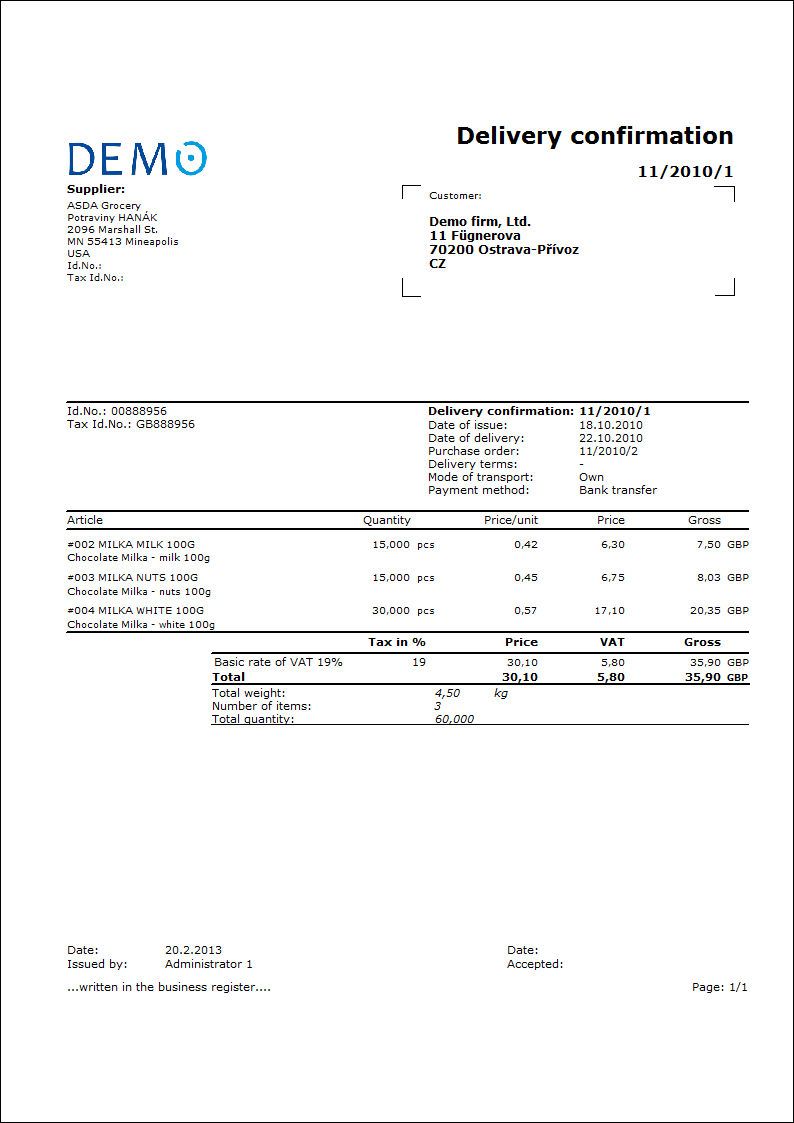 Delivery Confirmation is a document of a delivery of the articles by the supplier. The Delivery Confirmation has no impact on the accounting and its registration is not necessary. The Invoices serve as the tax documents and the Receipt Cards serve as the receipt documents.