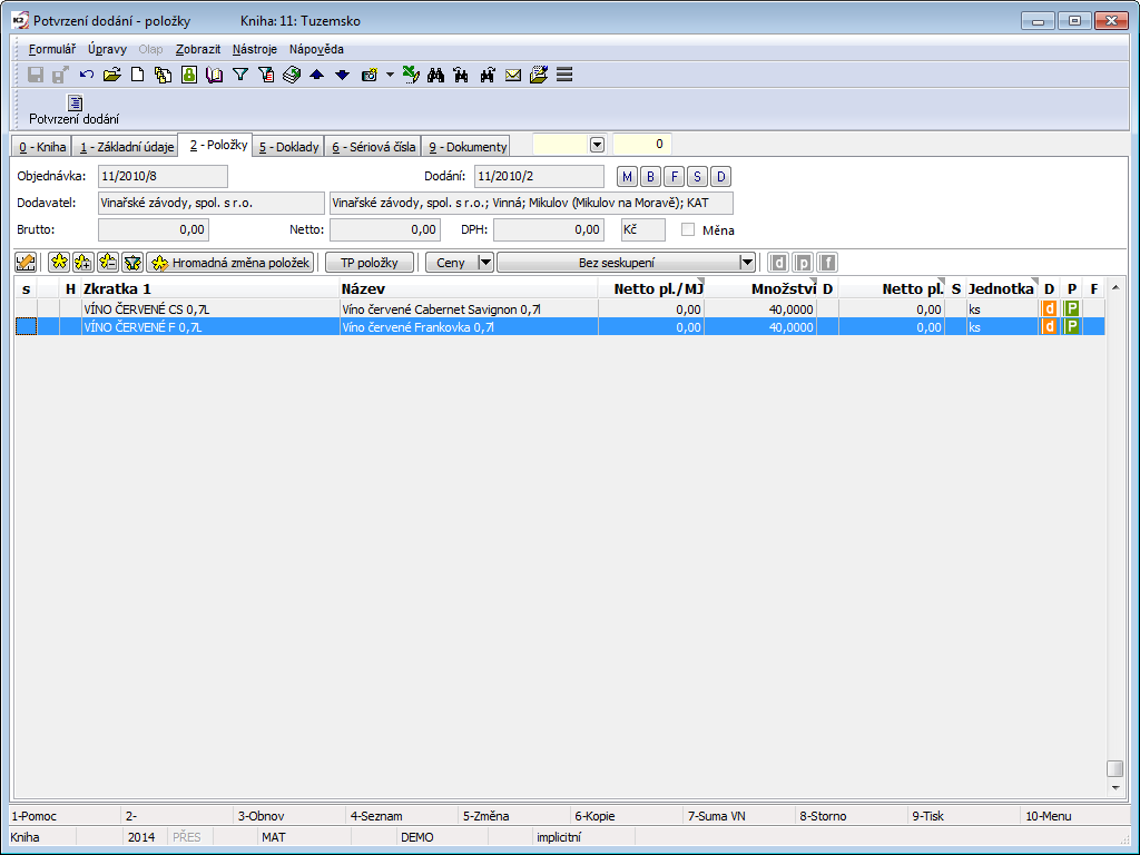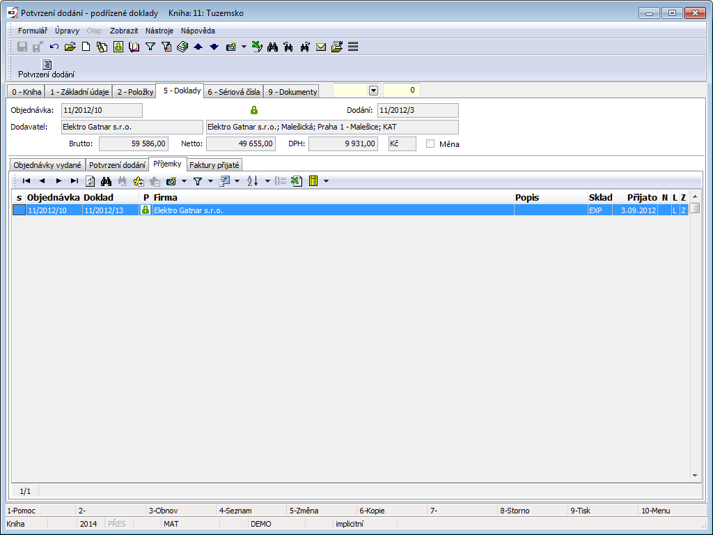 On the 5th. page of the Delivery Confirmation card, there is an overview of all documents that are with linked by this document by means of a superior document (orders issued). You can move between the individual documents by pressing the Ctrl key and the initial letter of the document simultaneously. It is also possible to display the selected document by pressing the Enter key.
