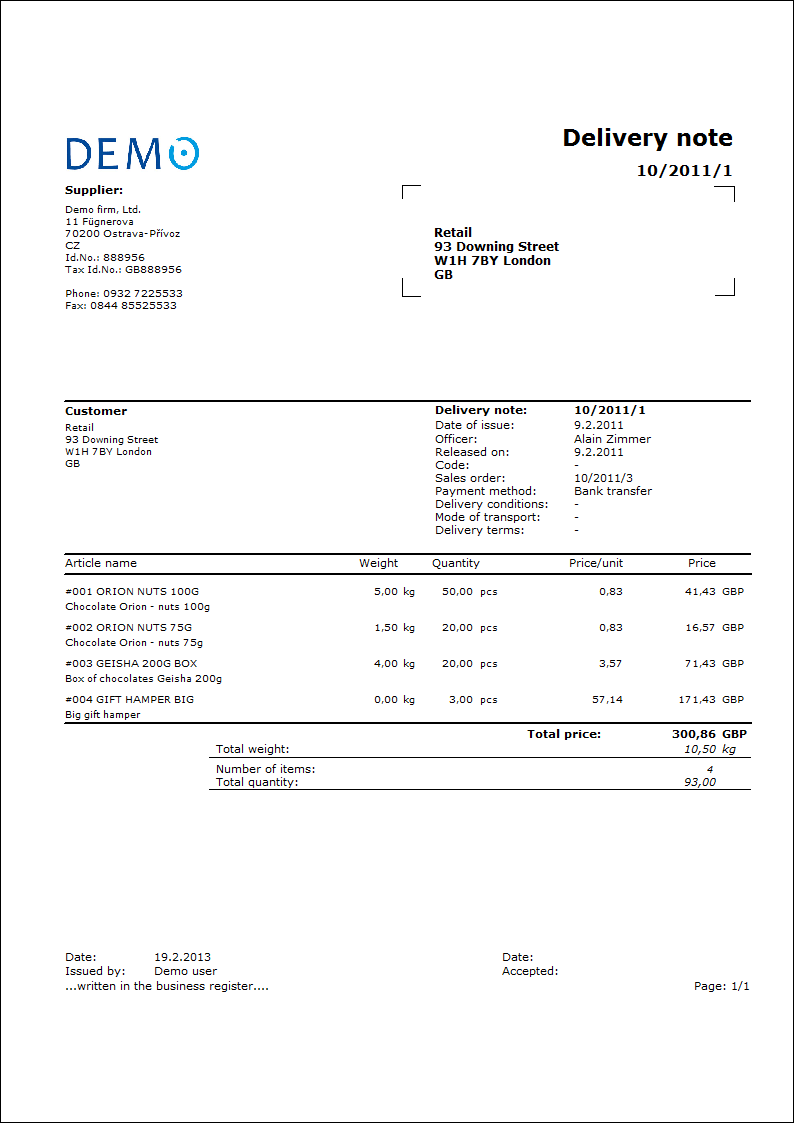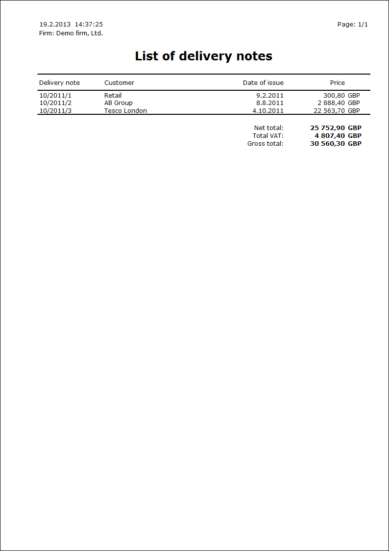 The record of Delivery Notes may be useful if the Delivery Notes Out correspond neither to the Invoices or the physical release. This may appear e.g.at larger deliveries, where the Delivery Note (the protocol on receipt of articles) may be signed after the actual physical receipt of articles. In that case, one may use this database to create a record and monitor which article has had the Delivery Note signed already.