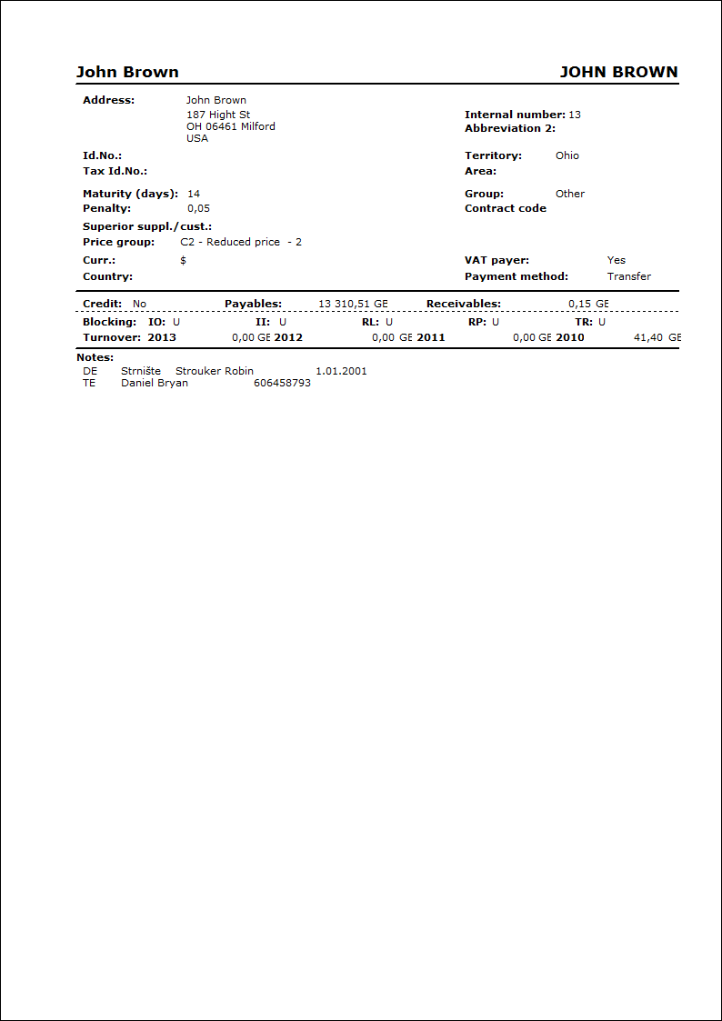 Report description: The report prints the customer's card, including turnovers for the current year, including the previous 3 years, and if a Partner is connected to the card, also data from the Partner or from the Activities. Displaying of a Partner and Activities can be limited by parameter.