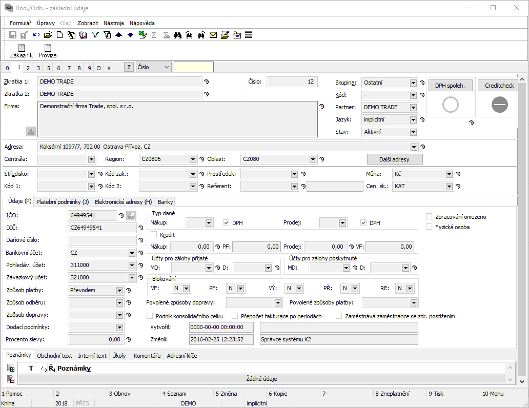 When creating a new Suppl./Cust.card, in K2 system a number is automatically assigned under which each Suppl./Cust. is uniquely identified throughout the K2 IS. This means that the change of a partial data in the card does not break the connection between this card and documents. You can change only these data which do not question the identity of a Suppl./Cust. If there is any change of the important data (e. g. because of a name, an address), you have to invalidate existing Suppl./Cust. card and to create a new one, see bellow. f you change the address on existing card only, you could not print the old documents with original data again. The correctness of the addresses is ensured by the Address History form described in more detail in the chapter Basic functions - chapter Addresses.