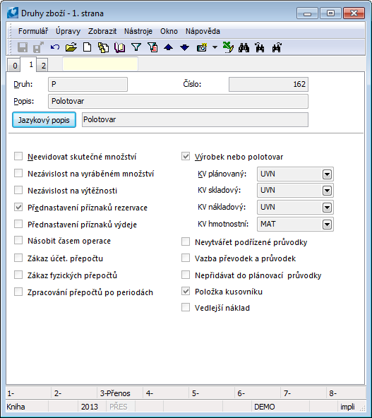 The type of articles is a key code for production and serves to distinguish articles into material, performance, energy, product, semi-finished product, yield and possibly other categories, which can be individually defined directly by the user according to their needs. Each type of article has defined properties that determine its behavior in production. Thus, production does not work "hard" with materials, outputs and times, but is defined parametrically. To change the types of articles for more items at once, it is possible to use bulk changes on the article filter.