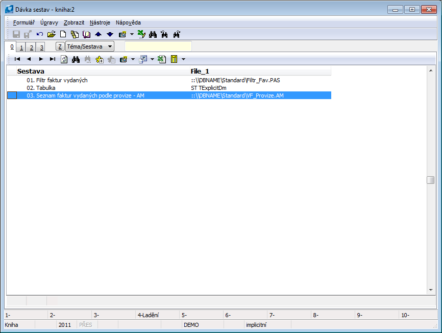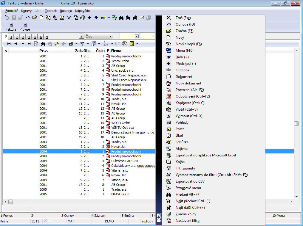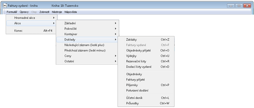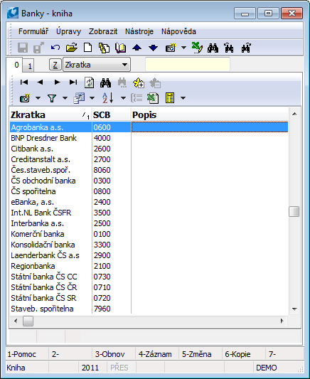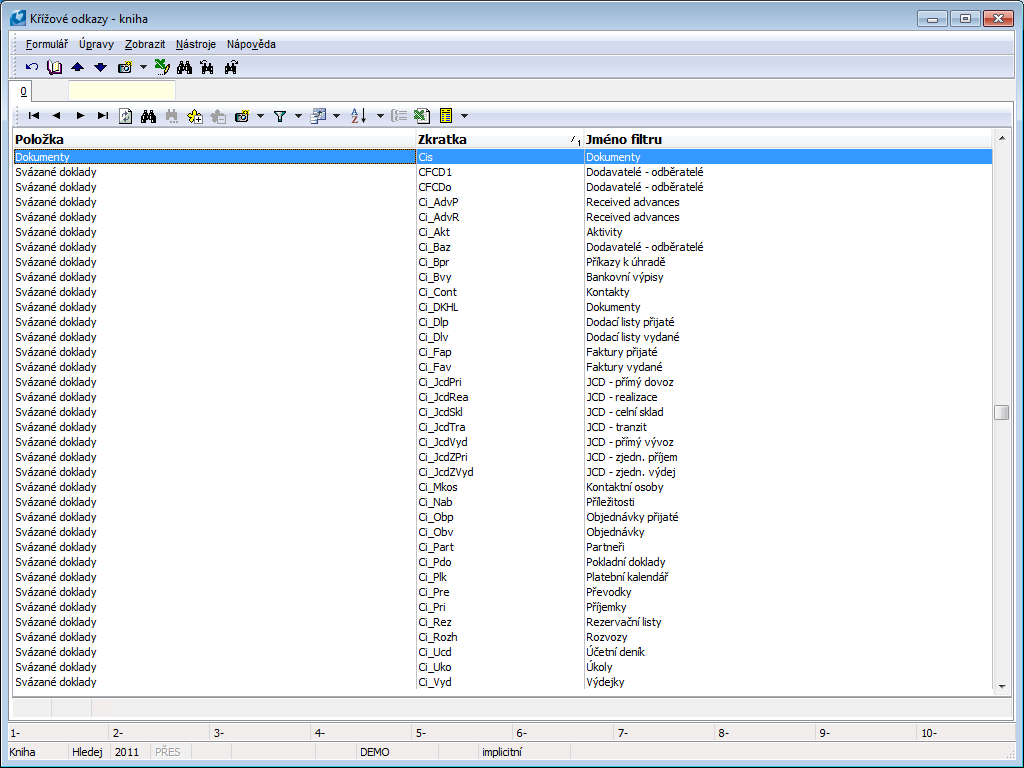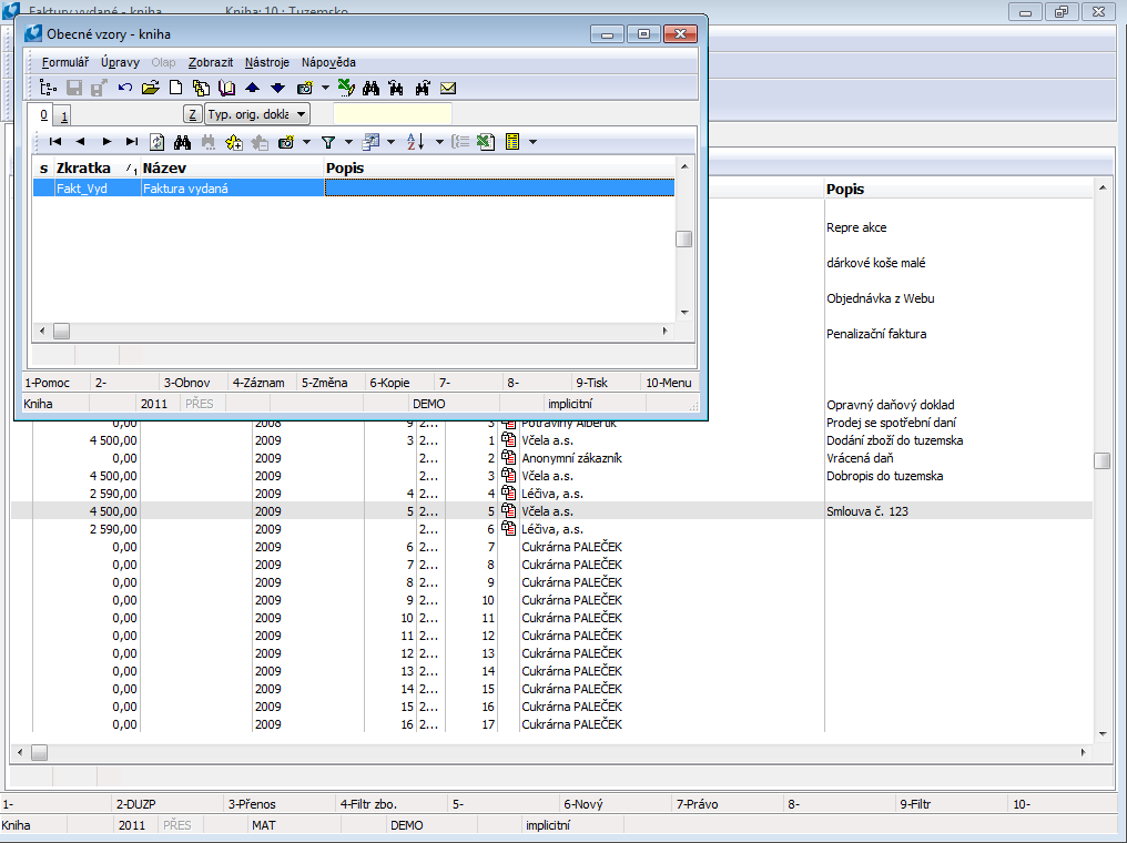 Book Depending on In Book mode the data are sorted according to the primary key (in Book – Period – Number documents, Abbreviation1 at Goods etc.). Whether the documents are structured into books, only data from the one book are displayed! Switching between individual books is usually executed by Alt+F10 keys. |