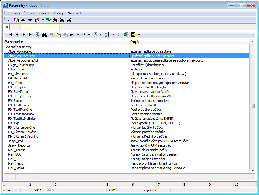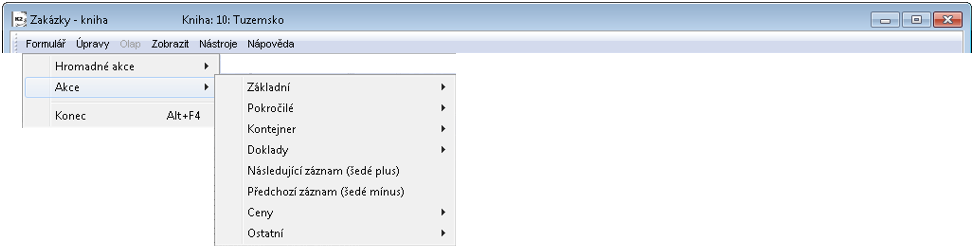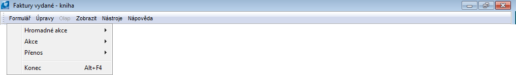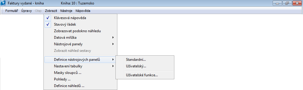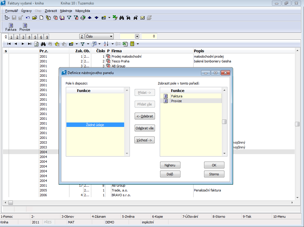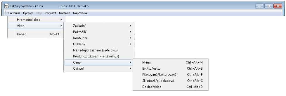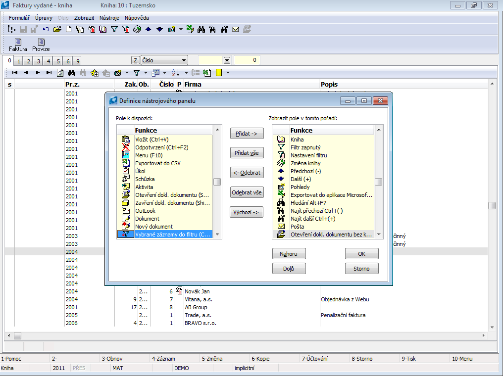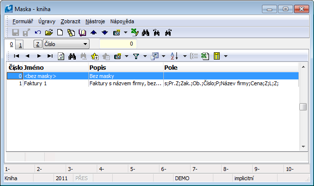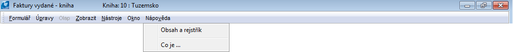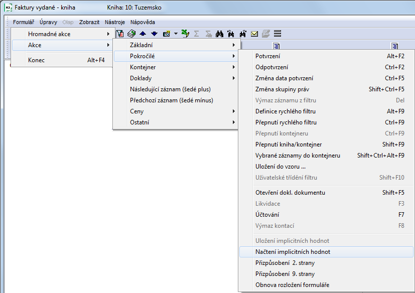 Book Depending on In Book mode the data are sorted according to the primary key (in Book – Period – Number documents, Abbreviation1 at Goods etc.). Whether the documents are structured into books, only data from the one book are displayed! Switching between individual books is usually executed by Alt+F10 keys. |
