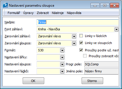 - Add to columns of form - this option allows to select the form in which is wanted to paste the requested column. If one of the code lists is open in the current form, it is possible to add fields from this code list to the current form. In Sales orders, there it is possible to open e.g. the Suppliers/Customers code list. By using this option, it is possible to add the individual fields from the Suppliers/Customers module into the columns in Sales order.