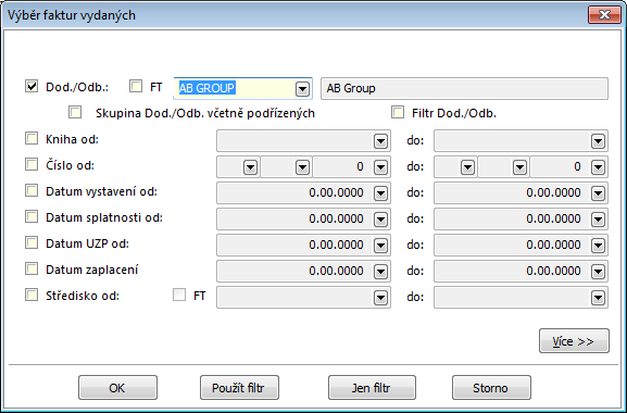 Example: If you position the cursor on an invoice of AB Group Company inthe Invoices Out book, all the invoices issued for this customer will be selected into the filter after pressing Ctrl+F9 keys.