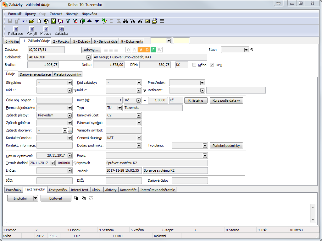 In the lower part of the form, it is possible to work with notes and supplements by using the Notes, Header Text or Footer Text tabs or by using the buttons PIC_957, PIC_958i and PIC_959i. Further description of work with these tabs is stated in the Basic Code Lists and Supporting Modules K2 – Notes chapter In the Activities tab, it is possible to create activities to the document. For the further description see the Activities chapter. There is the internal text entered in the Supplier/Customer card on the Supplier's internal text (purchase documents) and Customer's internal text (sale documents) tabs. Only on the Sales order document you can find the Internal text tab, which allows to enter arbitrarily long text for the sales order.