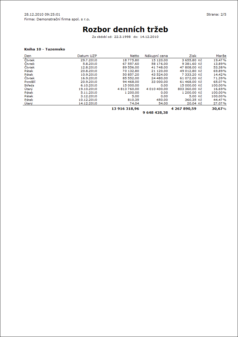 Popis sestavy: Přehled denních tržeb - podle zákazníků (po vybrání nabídky zákazníka).