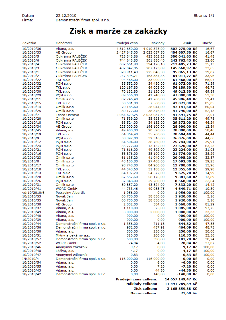 Popis sestavy: Seznam zakázek se ziskem a marží, setříděno podle Zisku.