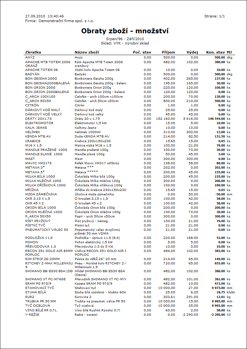 Popis sestavy: Obraty zboží za vybraný časový interval. Výstup lze vytisknout v cenách nebo v množství. Interní obraty (převody v rámci jednoho skladu, respektive mezi sklady jednoho sumačního skladu při zpracování nad sumačním skladem) se nenapočítávají. |