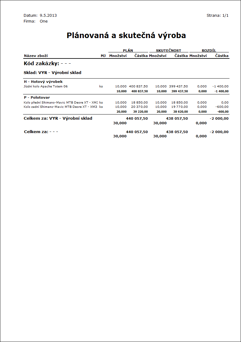 OrderByContractCode - Ano Seskupení dle kódů zakázek. Ano - seskupí údaje v první úrovni podle kódu zakázky. Ne - sestava nerozlišuje výrobu podle kódů zakázek. |
