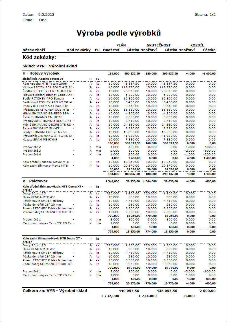 Popis sestavy: Sestava se spouští pouze nad Dispečerem (nutno zařadit na lištu). Zobrazí strom položek z jednotlivých průvodek, plánované a skutečné množství a cenu. Cena výrobků nebo polotovarů je napočtena z položek technologického postupu. Zobrazené položky odpovídají filtru druhů na Dispečerovi. Pod hlavičkou sestavy je zobrazen sumář druhů a jednotlivé ceny (plánovaná, skladová, nákladová) odpovídající požadavkům kalkulačních vzorců na záložce Kalkulace. Na konci sestavy je sumář Výrobků/polotovarů s grafy, které srovnávají plán a skutečnost plnění pro cenu (netto), množství a čas. |
