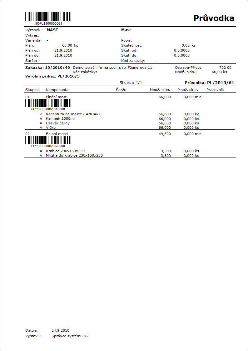 Popis sestavy: Sestava se spouští nad zakázkou. K položkám zakázky zobrazí strom existujících průvodek a všech jejich položek, plánované a skutečné množství a cenu. Hodnoty ve stromu průvodek jsou u položek z položek plánovací průvodky, hodnoty u polotovarů a výrobku jsou z hlavičky plánovací průvodky. Pod hlavičkou sestavy je zobrazen sumář druhů a celková plánovaná a skutečná cena za tyto druhy. Nápočet je proveden jen pro druhy dle zadaných kalkulačních vzorců. Na konci sestavy je ve výchozím nastavení zobrazen seznam průvodek ze stromu průvodek. V případě plánovacích průvodek jsou zobrazeny také k nim existující odváděcí průvodky. |