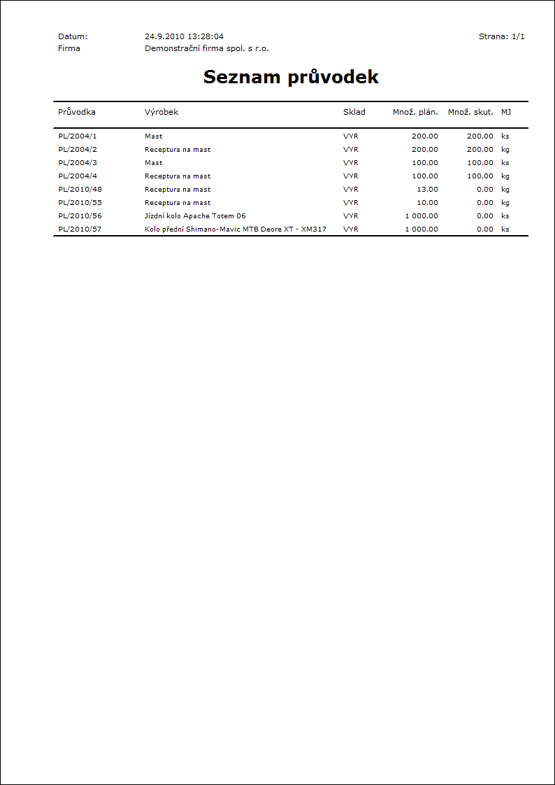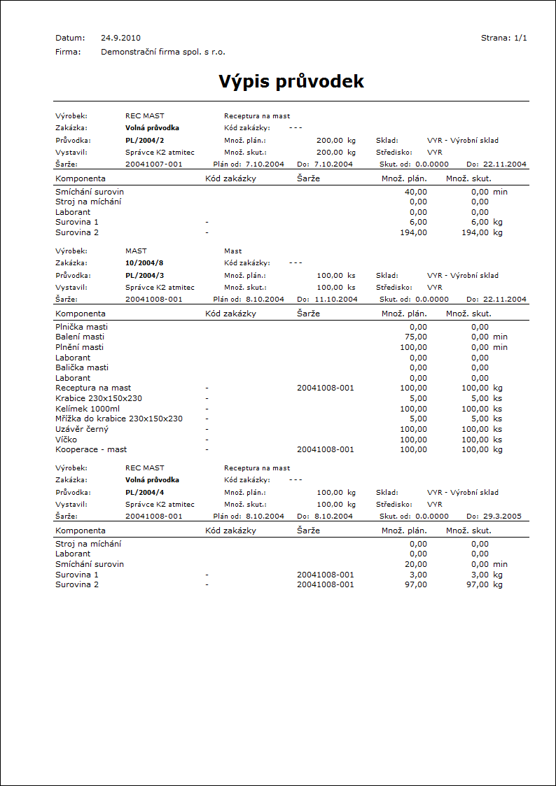 Popis sestavy: Sestava se spouští pouze nad Dispečerem (nutno zařadit na lištu). Zobrazí strom položek z jednotlivých průvodek, plánované a skutečné množství, termín výroby od - do (pro polotovary/výrobky se jedná o Termín od - do z 2. strany Průvodky, u položek je to Poč. rez, Kon. rez.) a Výroba od do (pro polotovary/výrobky se jedná o Termín od do ze 4. strany Průvodky, u položek je to Poč. výroby, Kon. výroby). |