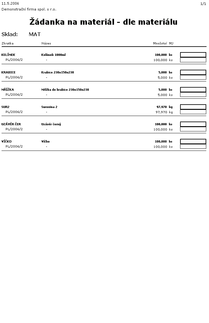 Výroba - žádanka na materiál - podle materiálu