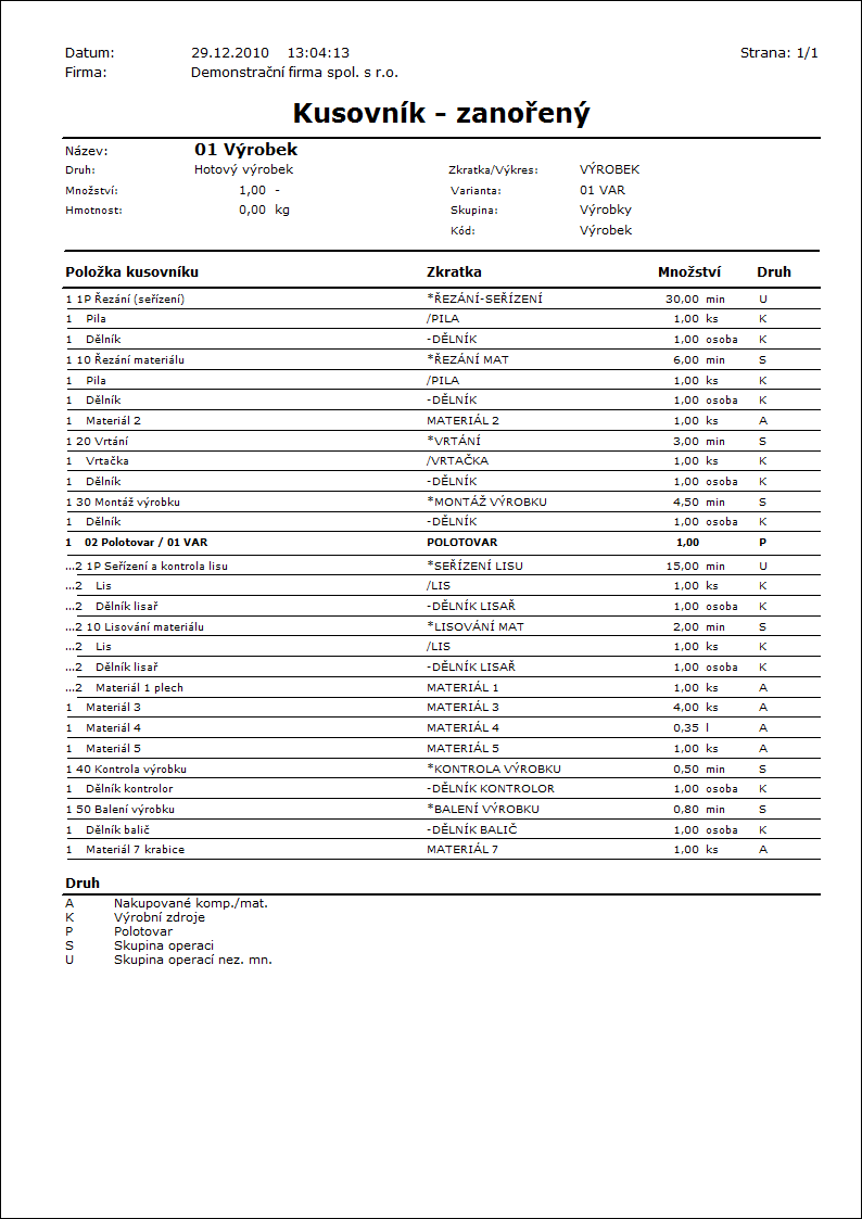 Popis sestavy: Zanořený kusovník výrobku - tiskne položky technologického postupu výrobku se zanořením do polotovarů. |