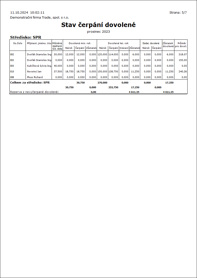 Popis sestavy: Přehled o aktuálním stavu dovolené. V posledním řádku zobrazuje také rezervu z nevyčerpané dovolené v Kč. |