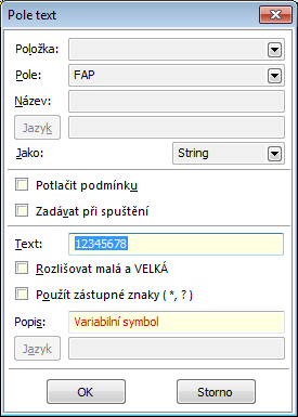 Toto hľadanie môžeme zadávať tiež pri nastavovaní parametrov stĺpca (pozri kapitola Základné funkcie - Funkcie Menu modulu - Zobraziť - Parametre stĺpca). Vo formulári Parametre väčšie ako potom zadáme podmienky na políčku Fulltext. Tu musíme navyše použiť znaky pre rozlišovanie veľkých a malých písmen: