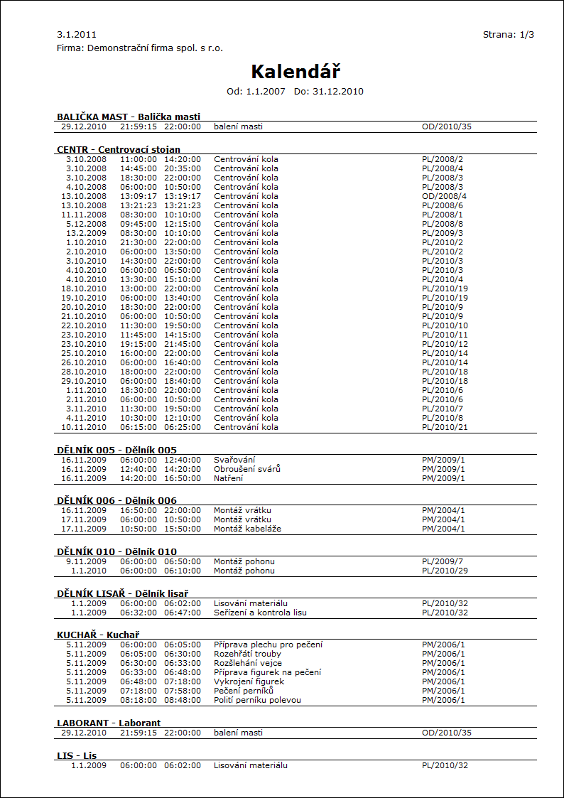 Popis sestavy: Vytiskne výrobní kalendář zdrojů. |