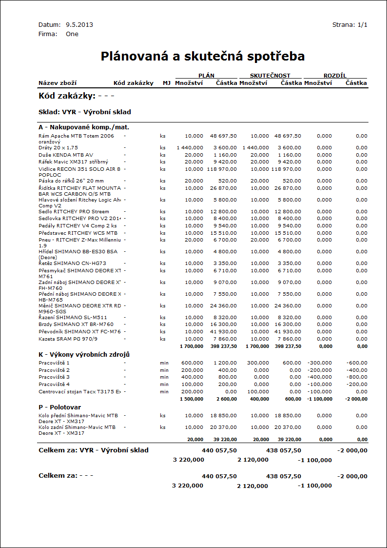 Popis sestavy: Přehled vyrobených produktů a spotřeby na jejich výrobu. Údaje se zobrazují v základních skladových jednotkách. |