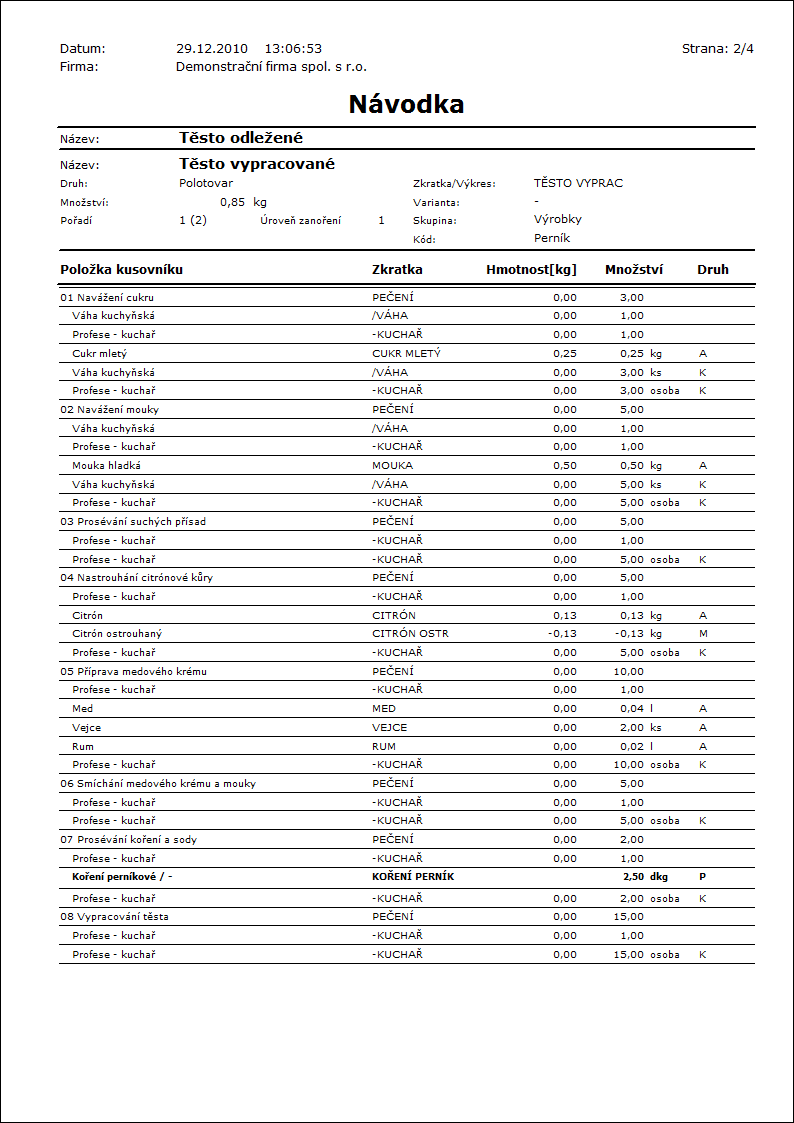 Popis sestavy: Zanořený kusovník výrobku - tiskne položky technologického postupu výrobku se zanořením do polotovarů. |