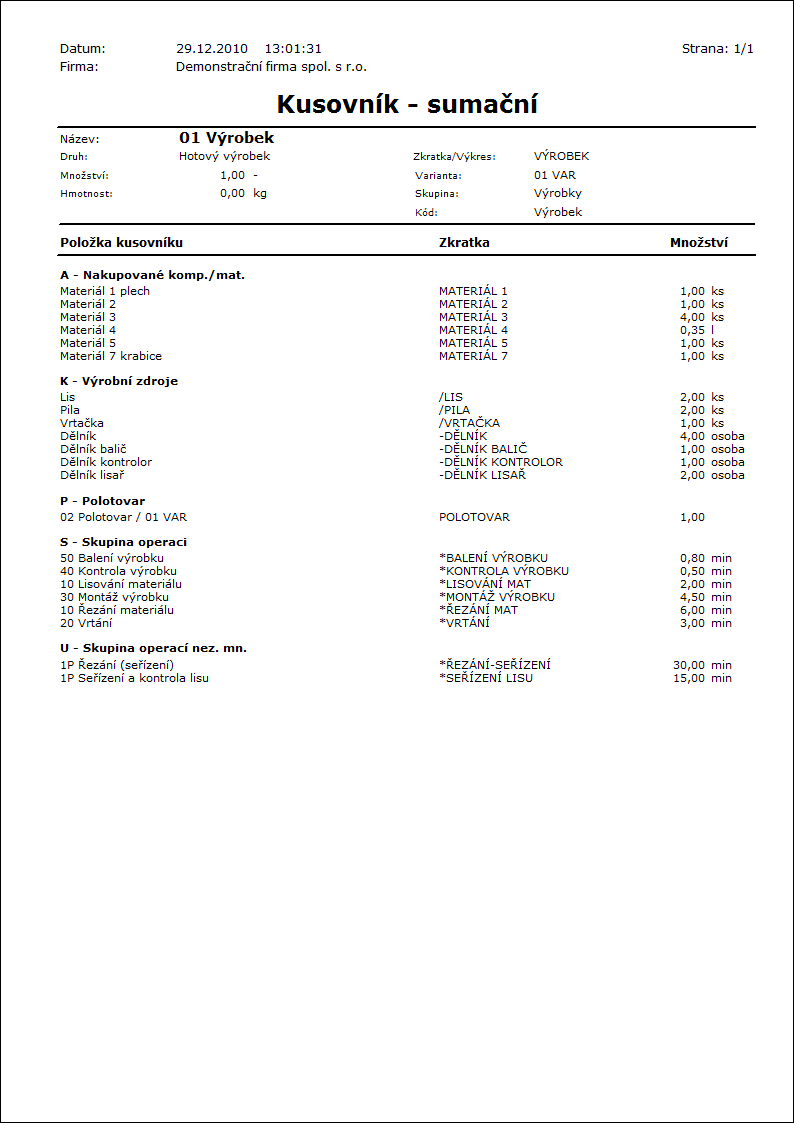 Popis sestavy: Sumační kusovník výrobku. Zobrazí položky TP včetně položek polotovarů v třídění podle druhu zboží. |