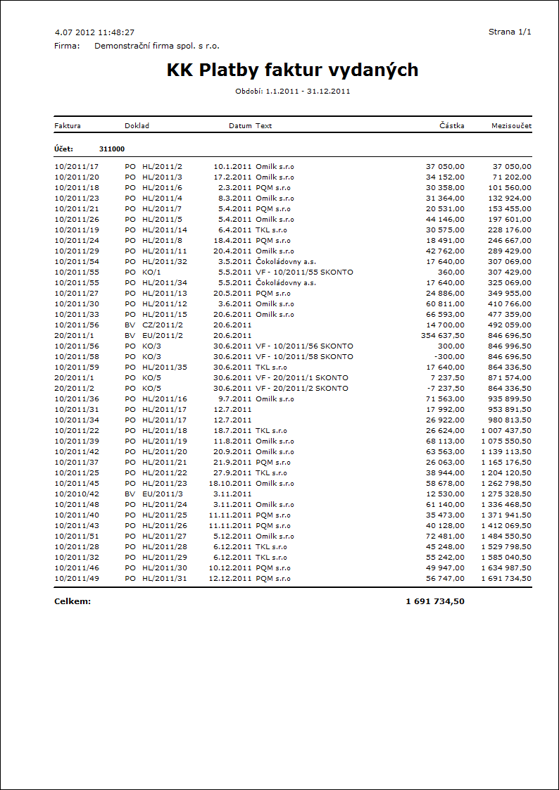 Popis sestavy: Sestava obsahuje seznam nezaplacených ostatních pohledávek seskupený podle pohledávkového účtu. U každého dokladu je vyčísleno brutto, zaplaceno a saldo. Za každý účet je k dispozici celkové saldo. |