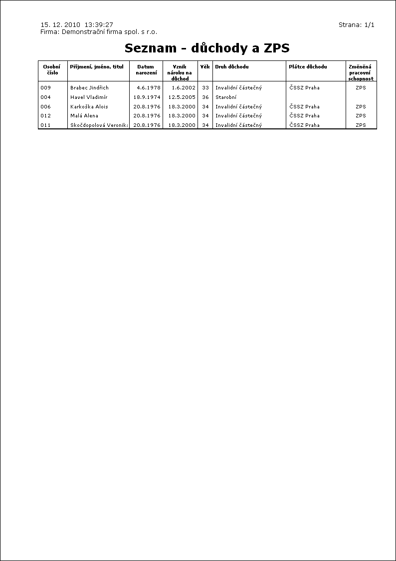 Popis sestavy: Seznam zaměstnanců pobírajících důchod, nebo zaměstnanců se ZPS. |