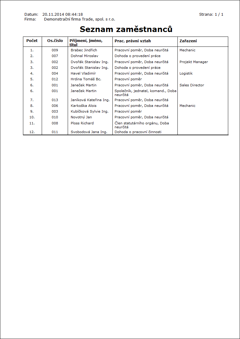 Popis sestavy: Seznam zaměstnanců s platným pracovním poměrem. |
