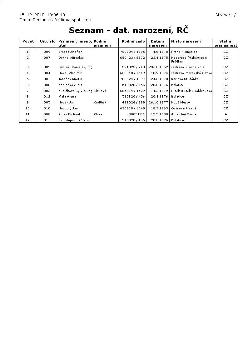 Popis sestavy: Seznam zaměstnanců s rodným číslem, datem a místem narození. |