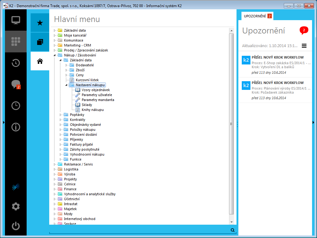 Obr.: Otevřené menu modulu Nákup/Zásobování - Základní data - Nastavení nákupu
