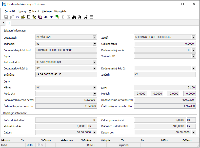 Descriptions of the individual fields of Supplier Prices form are stated in the User Guide of the K2 IS.