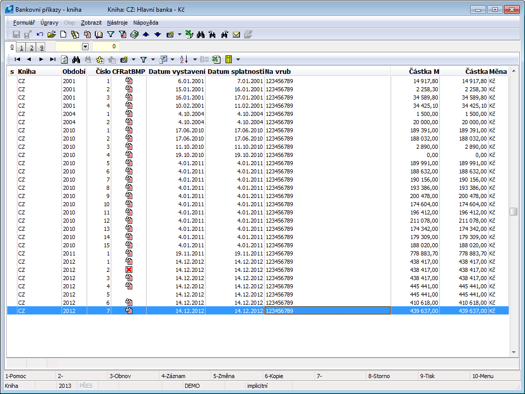 Code list Card of bank documentis predetermined for frequently used items. The data from the card is copied into the item of bank order and bank statement so that it is no longer necessary to enter them manually.