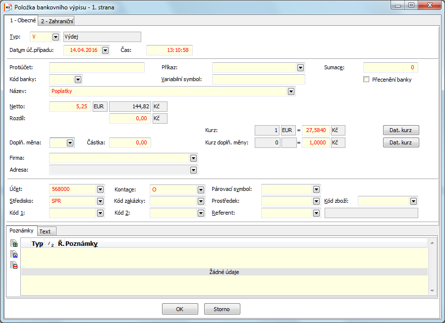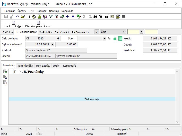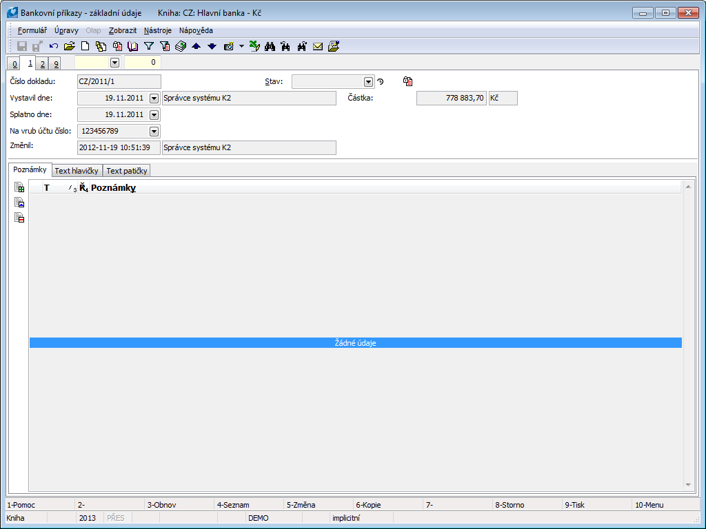Notes have been replaced with comments in the universal forms. On the Basic Data card the fields Sent and Date of sending were added, in which the user and a date, when the banker's order was exported via the HB function - banker's order (HB_Order.pas), is filled in.