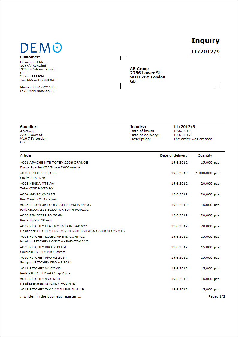 Report description: Request for Quotation (Purchase Order without the price). The report enables to save parameters into the "*.xml" file. The bulk export into the "*.pdf" file and sending by email are possible. |