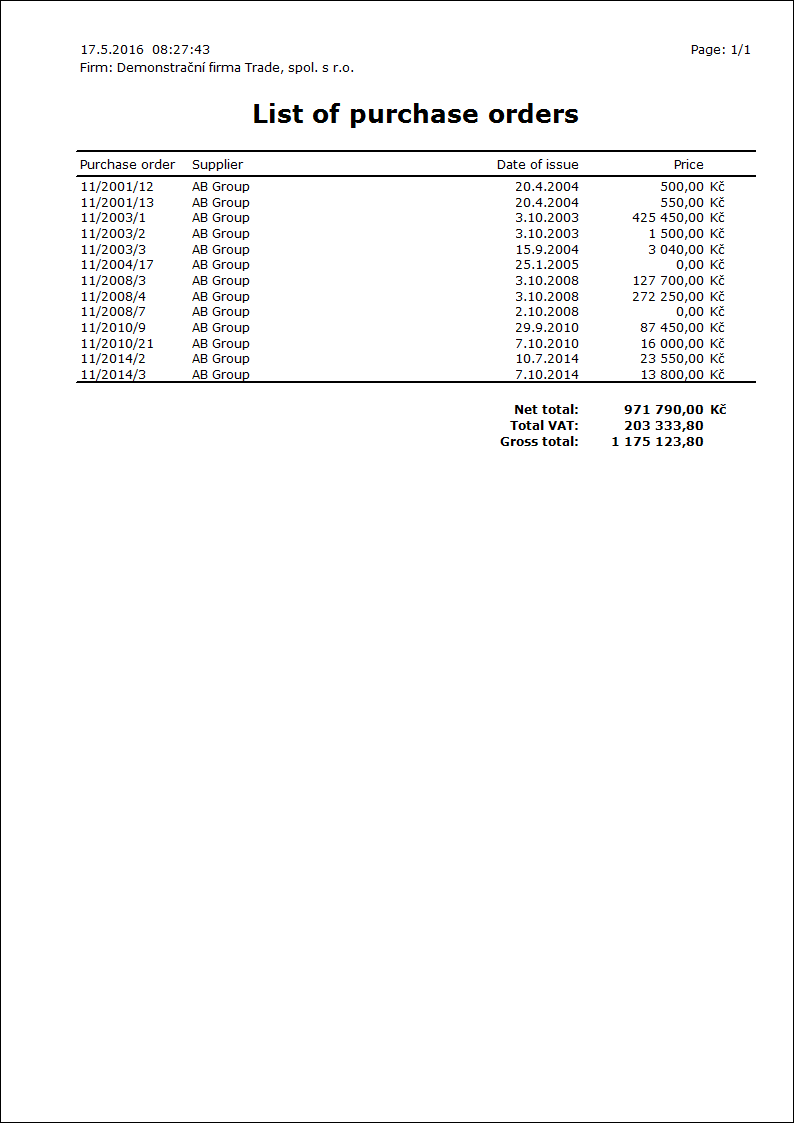 On the 1st page of the Purchase Order document are basic data that create the so-called 'document heading'. The heading data (first three rows) are also displayed on the other pages of a document.