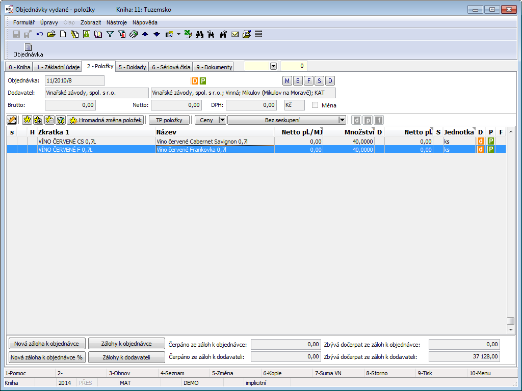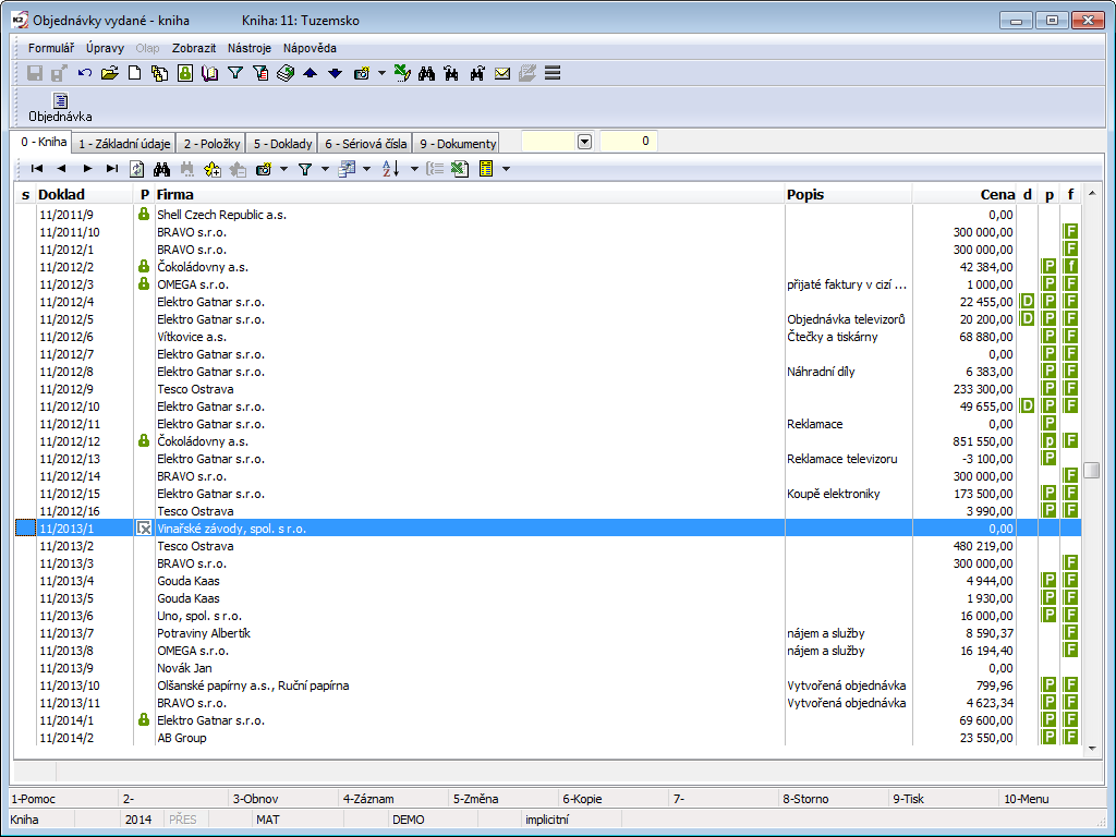 If the order has already been saved (has its own number), it cannot be deleted. Only unconfirmed orders can be cancelled with the F8 key. A cancelled order remains in the database with its content untouched and it only has the cancellation flag. It is therefore always possible to find out what its content was. A cancelled order cannot be edited, which is similar to the confirmation.