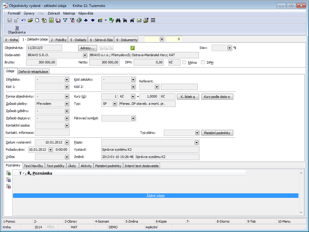 In the lower part of the form, it is possible to work with notes and supplements by using the Notes, Header Text or Footer Text tabs. Further description of the work with attached documents and ext. documents is stated in the Basic Code Lists and Supporting K2 Modules - Notes chapter. Supplier Internal Text tab serves to display the supplier's internal text. Then you can use the folders Tasks and Activities. Closer description of work with the folders is stated in the Tasks - Document Folder and Activities - Document Folderchapters.