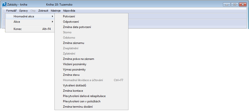 (Bulk change of items) in the blue bar , it is possible to modify the values in the document items in bulk, including the discount, in the Change. For further description of this function, see the Bulk Edit Document Items and Purchase and Sale Items chapters. The function can also be called with the Alt + K keys.