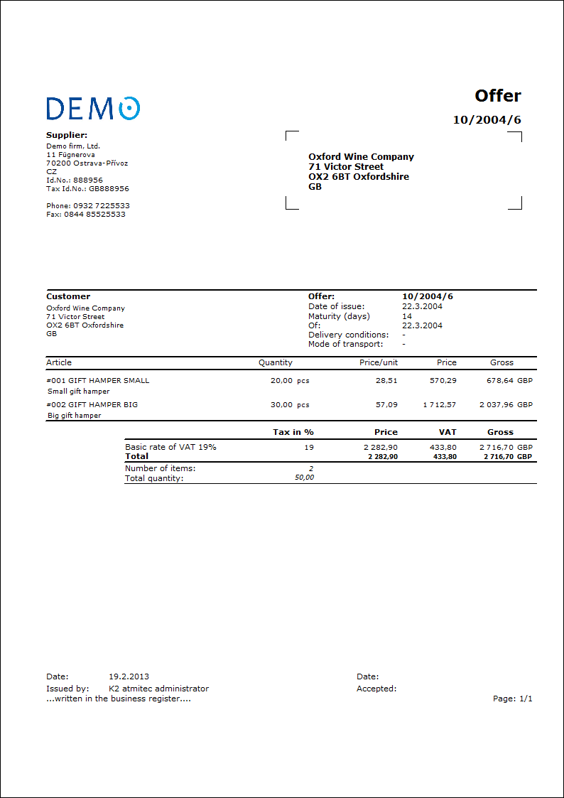KeepEnvelopeFormat - No No - the blank space under a place for envelope window is hidden. The saved place is multiplied, if the "ShowBarCode" parameter is set on "No". Useful if the user does not use the window envelopes and does not want to fold the printed document into an envelope according to the cam line guide of a document. Yes - the place is not hidden - the line between items and the address part will always be in one third of the page. |