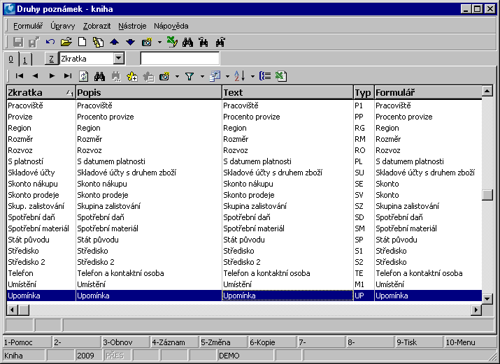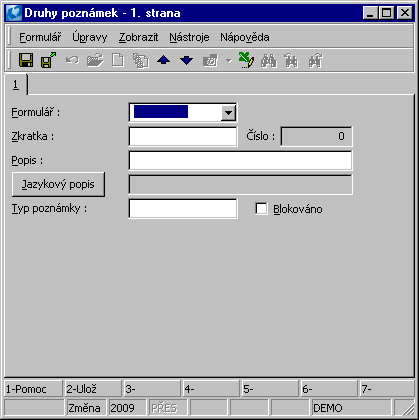 In the Note forms book you can insert new types of random notes by pressing Ins key. There are predefined forms that determine the proper shape of notes. The user enters abbreviation of a note type that enables more comfortable search. Further, the user fill description and note type. After save of a new note type the program assign a new number of this type automatically.