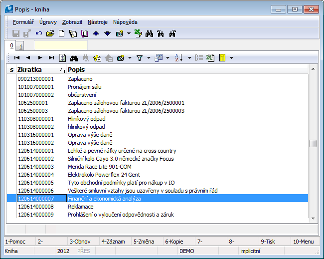 All notes have an abbreviation, a description, a note type and a form, that is used for setting of a note, in the Kinds of notes book. A special type of form is the Description (80 chars). To the notes, which use this form, it is possible to write random text with length max. 80 characters. Than this text will be assigned to the document. Some note types use a multiline form, that means during the entering of the note you have to fill several rows. The note is written only in one row on the document.