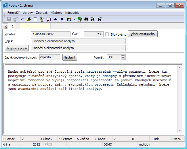 The Note of a Supplement type is a part of all standard reports. You select the supplements from the Language supplements book. By pressing Ins key you can define a new supplement on the 1st page of the Language supplements book. Contents of these supplements are saved in the database and are accessible in the others documents too. A supplement is characterised by the abbreviation and by multi-line content. The number of lines is variable and you can insert the supplements to various documents through the notes. In the notes only one row of a supplement will display. You can insert more supplements to the one document.