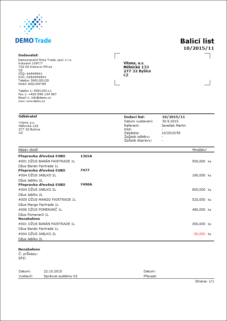 Popis sestavy: Zakázka odběratele. |
