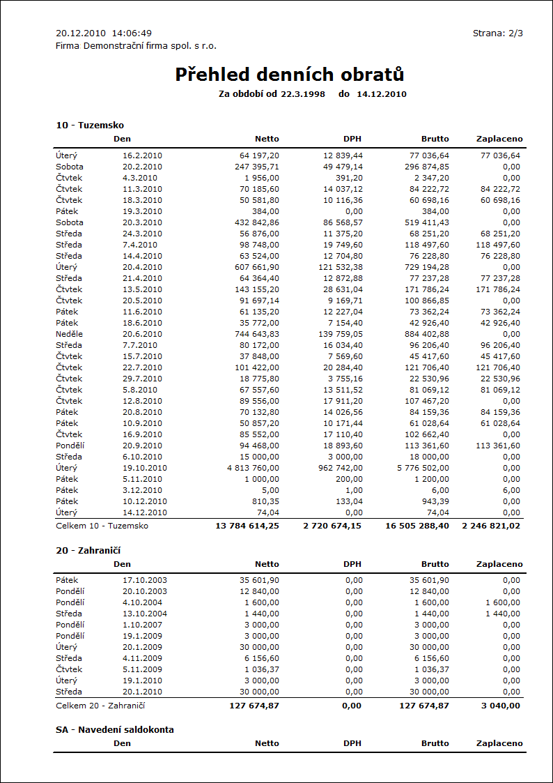 Popis sestavy: Přehled denních tržeb. |