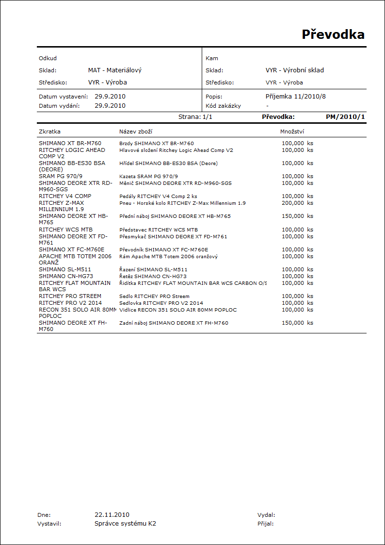Adresa ve stromu: [Sklad] [Prodej / Zpracování zakázek] [Výdejky] [Prodej / Zpracování zakázek] [Základní data] [Zboží] [Nákup / Zásobování] [Příjemky] [Nákup / Zásobování] [Základní data] [Zboží] [Výroba] [Základní data] [Výroba] [Řízení výroby] [Průvodky] |