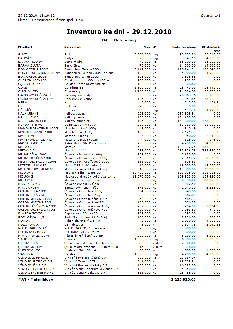 Popis sestavy: Sestava vytiskne inventuru zboží v členění podle účtů, na které se dané zboží na jednotlivých skladech účtuje (nastavení v poli Druh účtování nebo v poli Účet příslušného skladu).