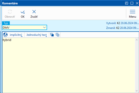 Pre niektoré špeciálne údaje o vozidle neexistujú polia na karte Vozidla. Tieto údaje sa evidujú do Komentárov (dole) na prvej strane karty Vozidla. Vytvorenie komentára typu DMV na 1. strane je potrebné: |